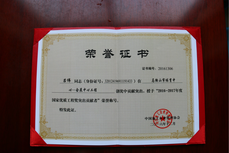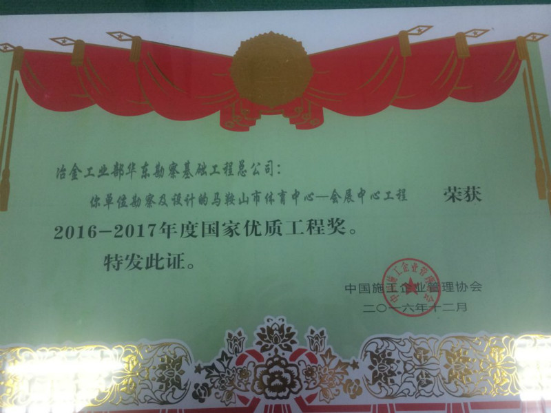 近日,由综合地质大队勘基三公司承担施工的马鞍山市体育中心---会展中心工程地质勘察项目在中国施工企业管理协会主办的2016年国家优质工程奖评选中荣获2016-2017年度第一批国家优质工程奖,项目负责人吕伟同志获得了该协会颁布的“2016-2017年度国家优质工程奖突出贡献者”荣誉称号。