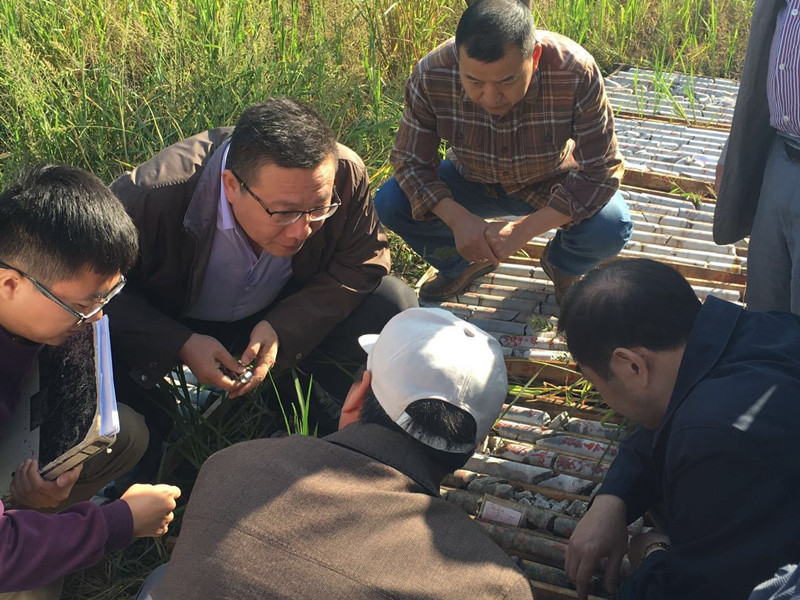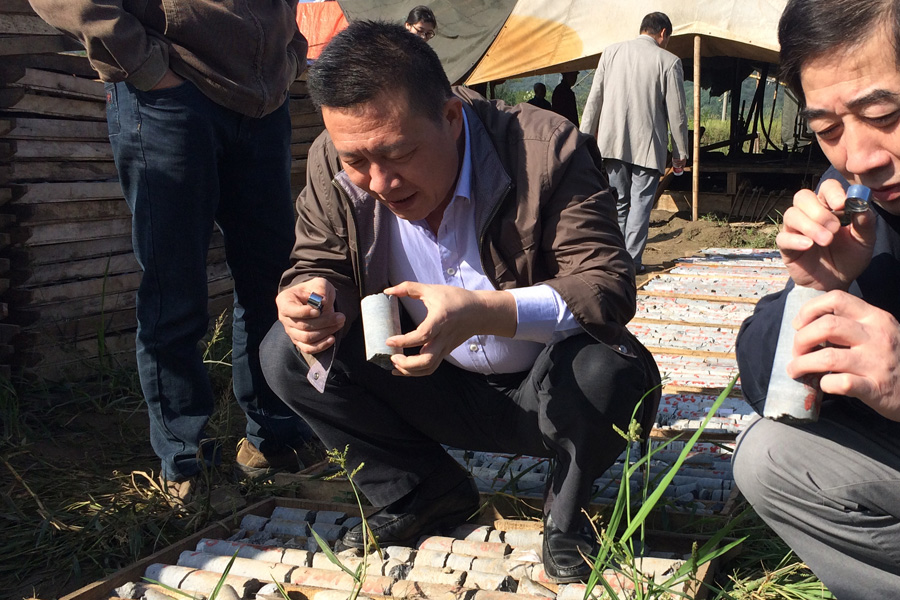 在项目施工现场 ,王彪副局长一行实地查看了该项目正在施工的钻机机台和岩心,仔细翻阅了野外地质资料,并对勘查区进行了实地野外考察。