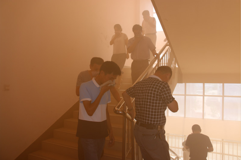 8月12日下午,在该队四楼会议室,泰平消防的赵克勤同志首先给所有参加演练的人员讲解了逃生知识,接下来副队长汪国际宣读了《综合地质大队消防应急疏散逃生演练方案》,李华队长做了消防演练的动员讲话,全体人员开始实施该方案。15:26,该队安全科点燃了位于三楼和四楼的演习用烟雾弹。15:31,总指挥李华同志发出了逃生演练的口令。大楼每一位人员立即停止办公,打开办公室门,手捂着打湿的毛巾,沿着墙壁,弯着腰,往大楼西侧的楼梯口,紧急疏散。15:36,大楼全体人员全部安全地疏散到了一楼操场。