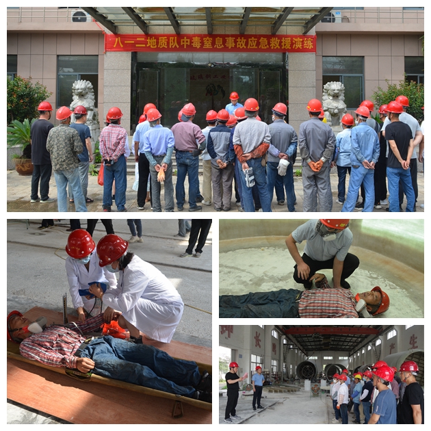 根据“安全生产月”活动部署,6月28日,八一二地质队玻钢公司组织开展了中毒窒息事故应急救援演练。演练由副队长丁晖主持,全队40余名职工参与。